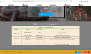 d’accéder aux sections principales : Mission, Régions, FAQ, Contact et Member. La page Mission propose un tableau structuré des sites touristiques,